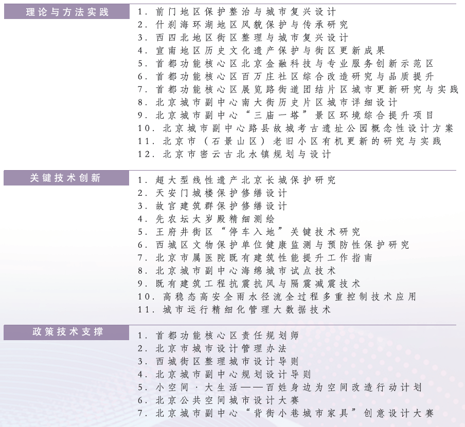 多年來(lái),北京建筑大學(xué)在“歷史城市保護(hù)更新規(guī)劃理論與方法”、“建筑保護(hù)與更新關(guān)鍵技術(shù)”、“城市基礎(chǔ)設(shè)施功能提升關(guān)鍵技術(shù)”三大研究方向已形成一定研究基礎(chǔ),代表項(xiàng)目包括: