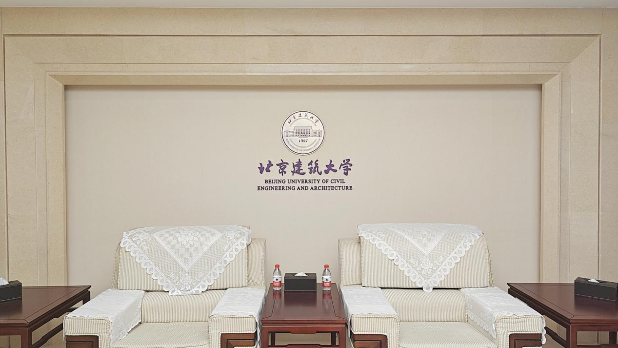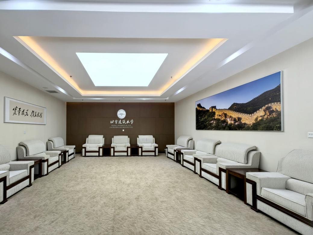體育館接待室內部裝飾于2025年5月打造完成。接待室居中位置精心設計安裝了北京建筑大學LOGO,主墻面裝飾長城攝影師董旭明老師《萬里長城》攝影作品,相對墻面配以北建大校訓書法作品,整體氛圍簡潔而不失精致。