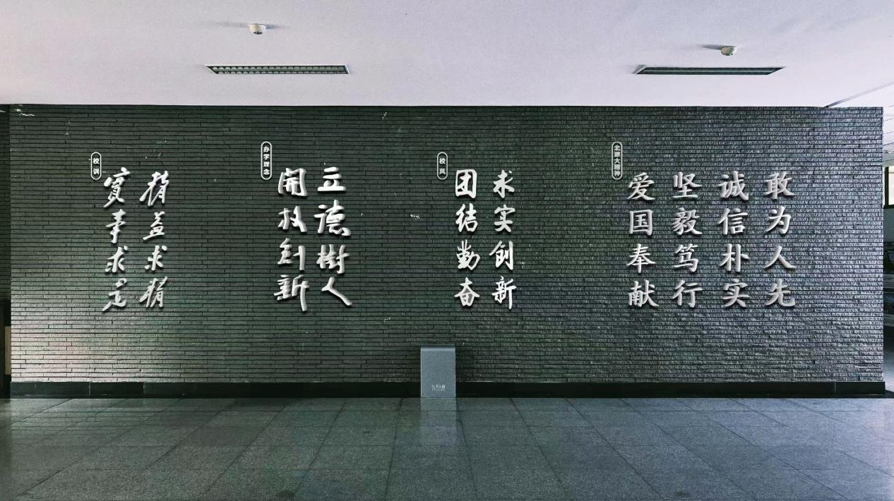 基礎教學樓A座一層西側門廳文化墻于2025年6月完成。此處為師生進入基礎教學樓A座的主通道之一,在門廳內設置學校精神文化體系展墻,讓師生更直觀地理解學校的精神文化傳統(tǒng),增強對百年老校文化內核的認同感和歸屬感,更好凝聚起“以校為榮、與校共進”的集體意識,激發(fā)推動學校發(fā)展的內在動力。